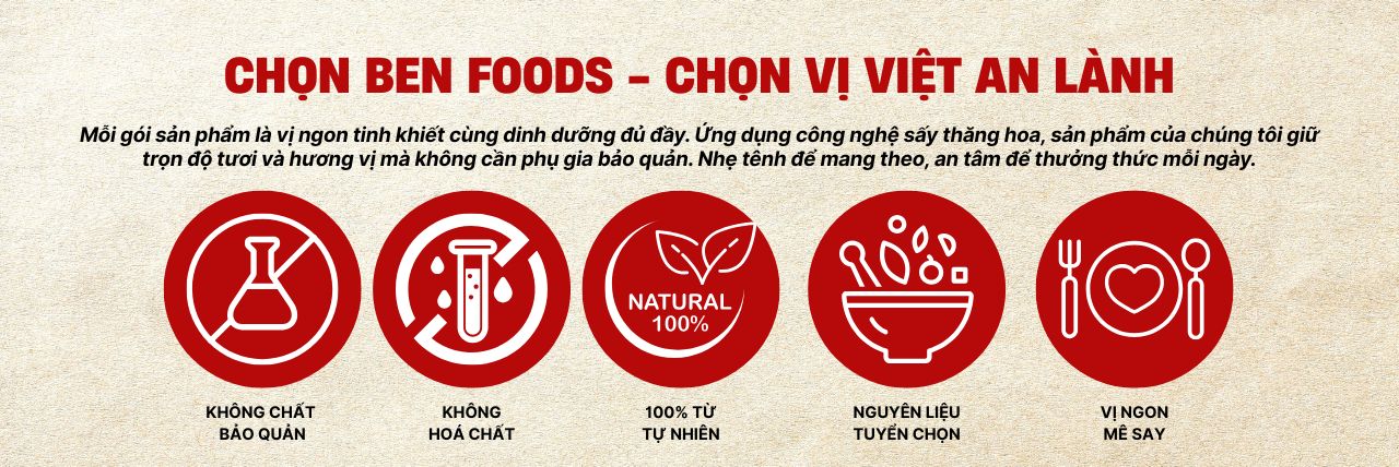 Tại Ben Foods, chúng tôi tự hào trong việc chọn lựa nguyên liệu chất lượng cao và áp dụng công nghệ sấy thăng hoa tiên tiến để giữ trọn giá trị tự nhiên. Thông qua quy trình kiểm soát chất lượng nghiêm ngặt, mỗi sản phẩm đều không chứa phụ gia, chất bảo quản hay hương liệu nhân tạo, mang đến thực phẩm thuần khiết và lành mạnh, gần gũi với thiên nhiên nhất.